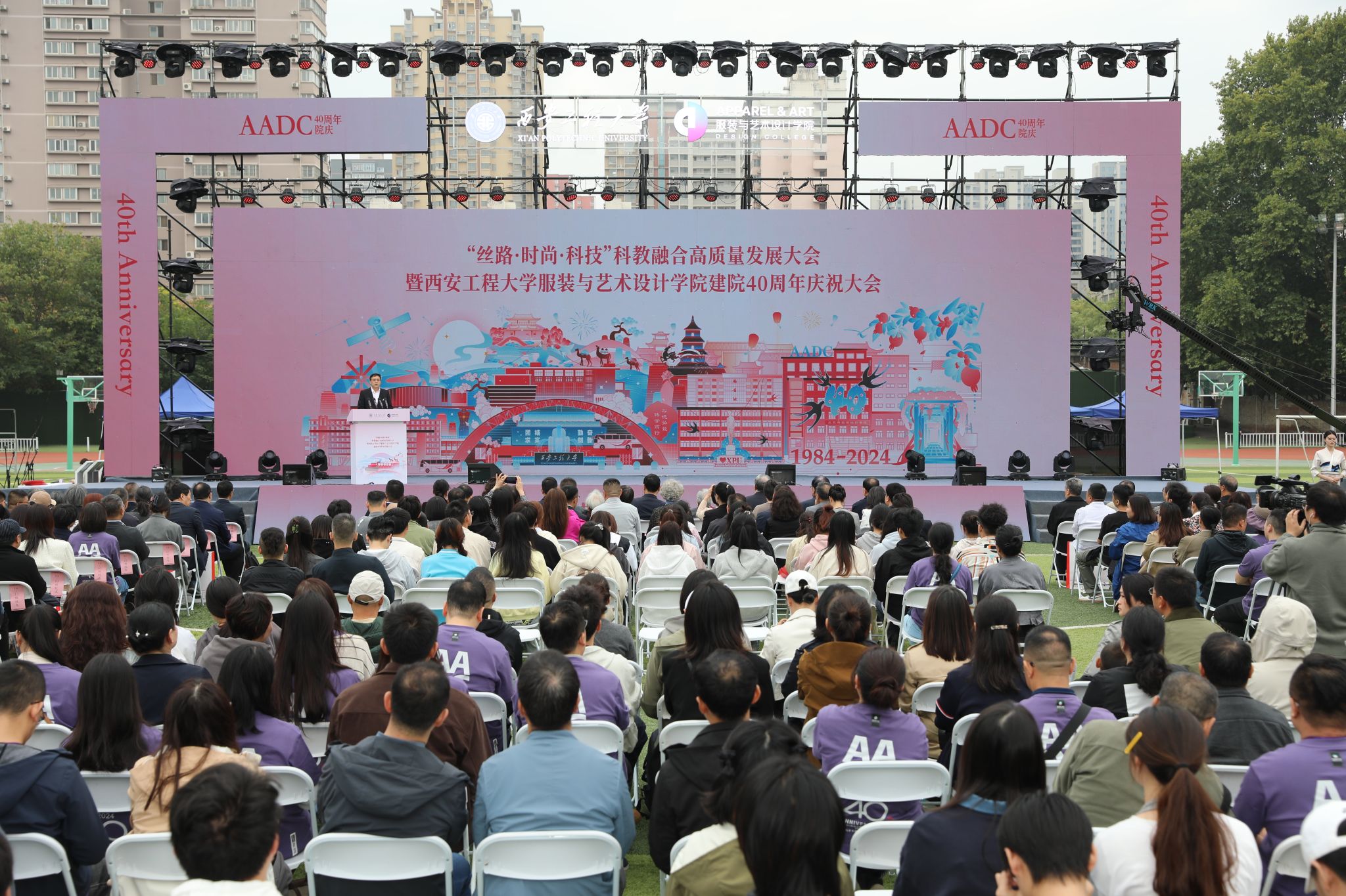 10月19日,服装与艺术设计学院在金花校区举办“丝路 时尚 科技”科教融合高质量发展大会暨建院四十周年庆祝大会。校领导马万清、朱永民、戴鸿、夏蔡娟、张洛红,国内相关领域专家学者、行业领军人物、企业代表及支持学院发展的社会各界朋友,学院老领导、离退休教师代表,校友代表,学校各职能部门负责人及学院师生共4000余人欢聚校园,共庆华诞。校党委书记马万清在致辞中介绍了学校的历史沿革和服装学院的办学特色及办学成效...