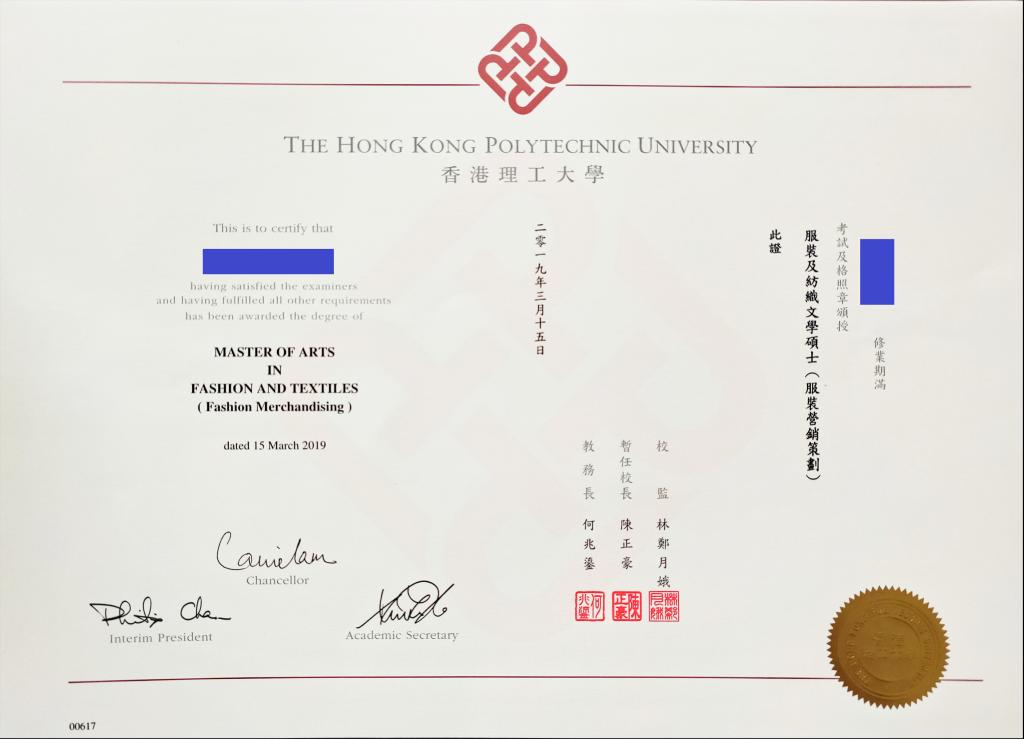 本硕士项目学制为1.5年,学生修完品质管理、国际服装与纺织品设计等11门课程并达到规定学分后,由香港理工大学授予“服装及纺织(服装营销策划)”文学硕士学位并颁发毕业证(经教育部认证)。本项目开办十余年以来,培养了400余名优秀毕业生。在2004年、2005年及2012年由教育部、陕西省教育厅组织的中外合作办学项目评估工作中本项目均获评优秀。