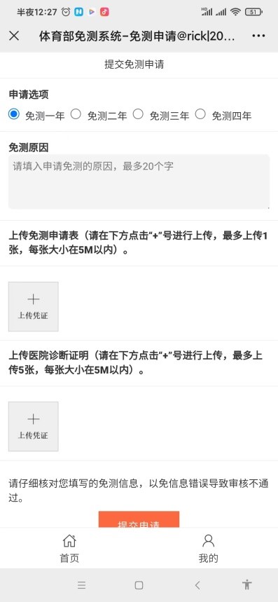 4、上传医院诊断证明和病历,单张不超5M,至多传5张,并能从诊断证明或病例看出是申请者本人,否则影响免测通过。