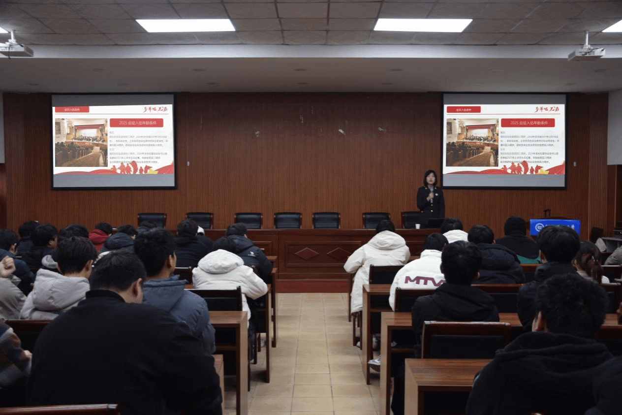 李元枫从参军的意义、应征入伍的条件、参军享有政策三个方面进行了详细解读,让同学们对参军入伍的条件、流程等有了详细的了解。他号召同学们穿上军装,扛起钢枪,告别稚嫩与迷茫,奔赴山河与战场,在热血军旅中镌刻属于自己的荣耀篇章。