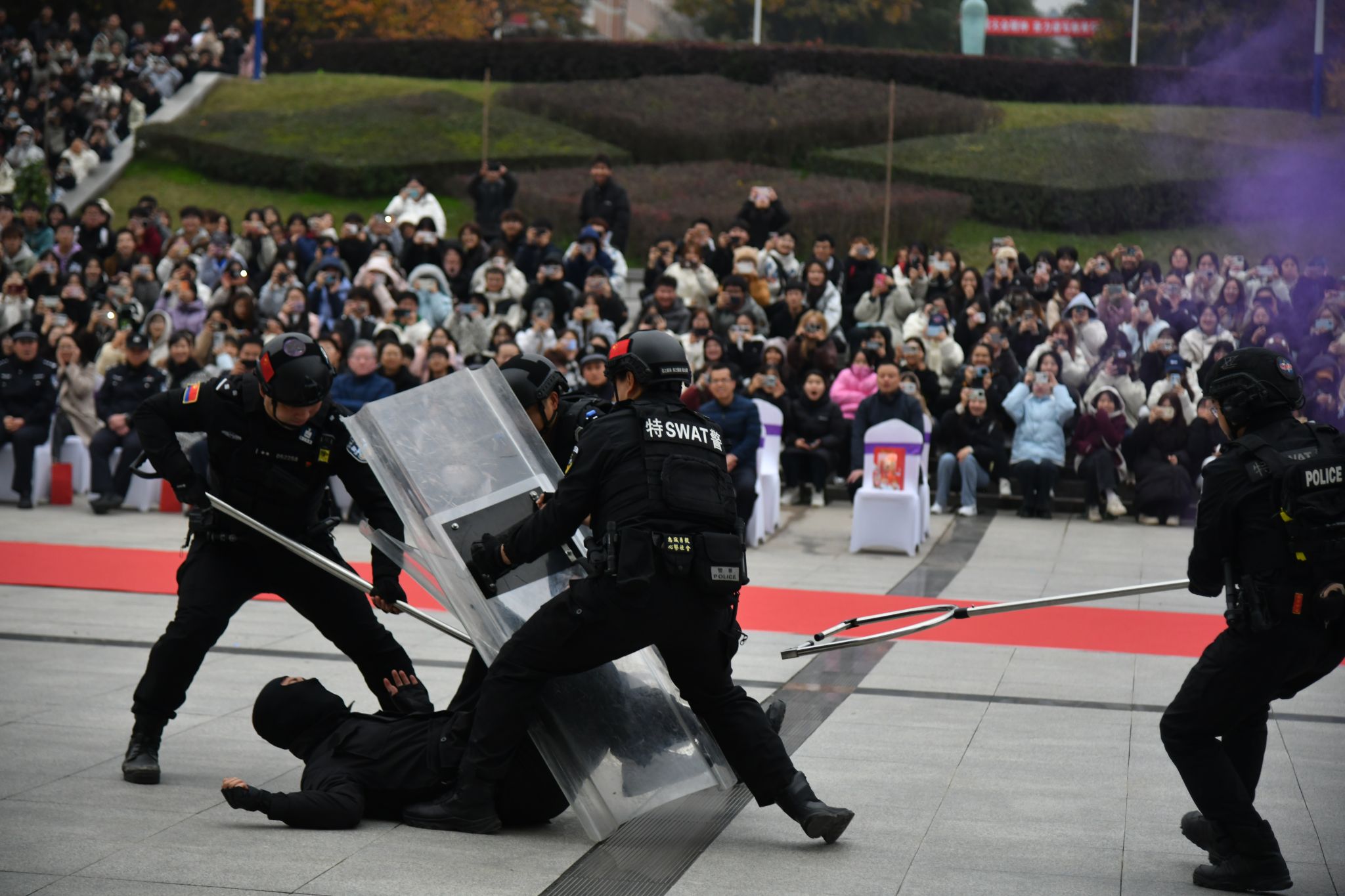 在反恐防暴演练中,临潼分局巡特警大队为现场师生展示了穿越机与无人机相互配合开展警务实战的场景;演练模拟校外“不法分子”持刀闯入校园,学校保卫处迅速启动应急预案,与警方联动,成功将“歹徒”制伏等场景,对应急避险的全过程进行实战演练;临潼交警大队开展了交通安全知识有奖问答、交通指挥手势及铁骑护卫表演;公安浐灞分局治安大队进行了警犬防暴搜救展示。整个演练过程组织有序、快速有效、技术要领熟练,充分展示了警员和校园安保人员应对突发事件的处置能力和专业素养。