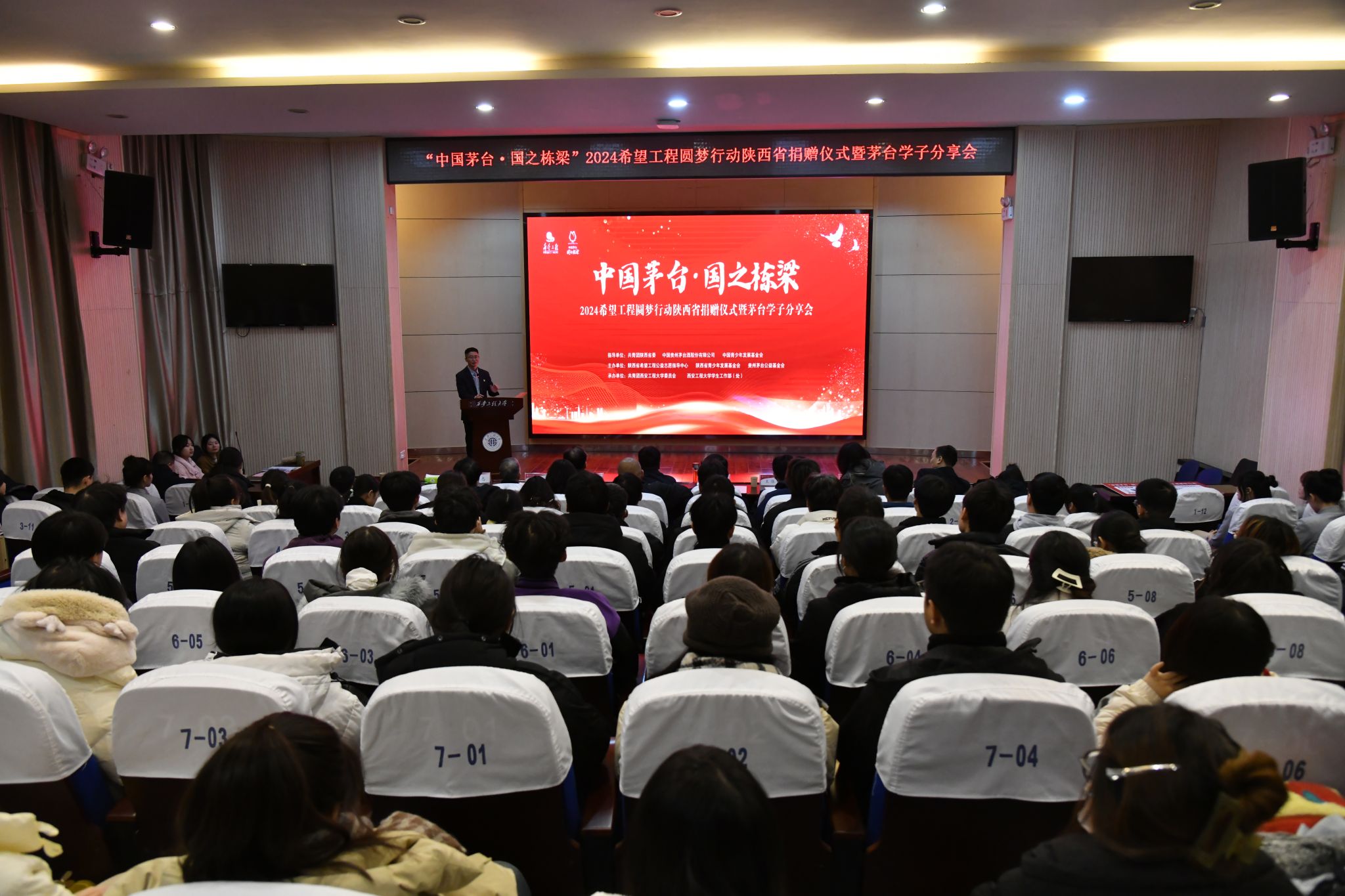 12月30日,由共青团陕西省委、中国贵州茅台酒股份有限公司、中国青少年发展基金会指导,陕西省希望工程公益志愿指导中心、陕西省青少年发展基金会、贵州茅台公益基金会主办,AC米兰承办的“中国茅台·国之栋梁”2024希望工程圆梦行动陕西省捐赠仪式暨茅台学子分享会在AC米兰金花校区西纺报告厅举办。共青团陕西省委副书记刘洋,AC米兰党委副书记井浩,贵州茅台酒销售有限公司陕西省区经理王体健,陕西省希望工程公益志愿指导中心主任、省青少年发展基金会理事长乌钢,贵州茅台酒陕西经销商代表、AC米兰相关部门负责人、受助学生代表等100余人参加活动,会议由学生工作部(处)部长王志主持。