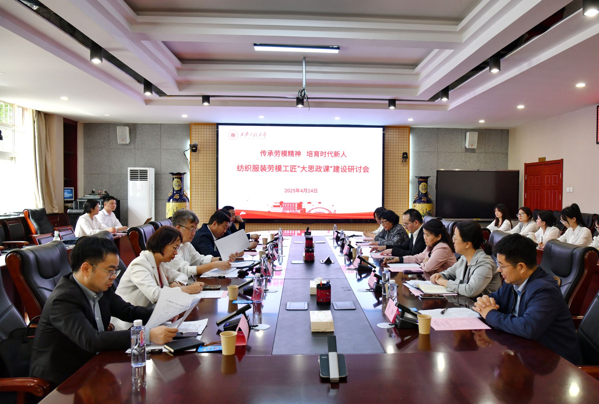 当日下午,纺织劳模工匠“大思政课”建设研讨会在金花校区第三会议室举行。研讨会由陕西省纺织职工思想政治工作研究会会长侯代会主持,来自工会系统、行业组织、高校的多位专家学者围绕“如何将劳模精神深度融入思政教育体系”“打造沉浸式实践课堂的校企协同路径”“劳模精神引领青年使命感培育的机制建设”等议题展开交流,为共同推动纺织劳模工匠精神的发展贡献智慧和力量。参会人员同时就发挥纺织劳模工匠“大思政课”研究教育基地、“梦桃精神 代代相传”全国纺织思想政治教育研究基地作用,进一步深化“劳模精神+思政教育”融合机制构建建言献策。