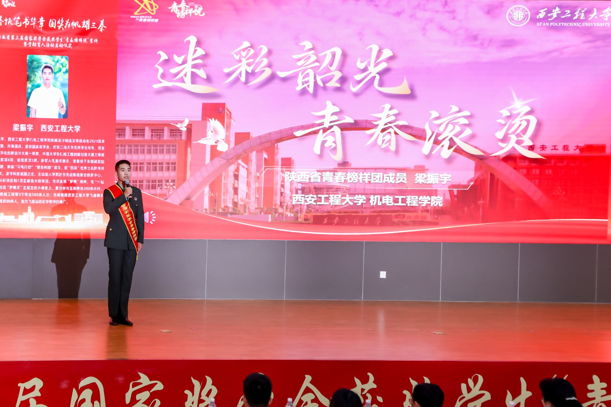 本次活动以“青春执笔书华章,国奖为帆耀三秦”为主题,在全省范围内遴选出11位来自不同高校和中职学校的国家奖学金获得者代表进行分享。梁振宇以“迷彩韶光 青春滚烫”为题,分享了自己的青春成长故事。他在资助政策的温暖和学校“一站式”学生社区“梦桃式”互促互优团队的帮助下,凭借自己的勤奋和努力,获得了国家奖学金。他投桃报李,将自己的光和热继续传递,在学业方面累计帮扶身边的500多位同学。他用自己的亲身经历告诉同学们,只要努力,就一定能够实现自己的梦想。