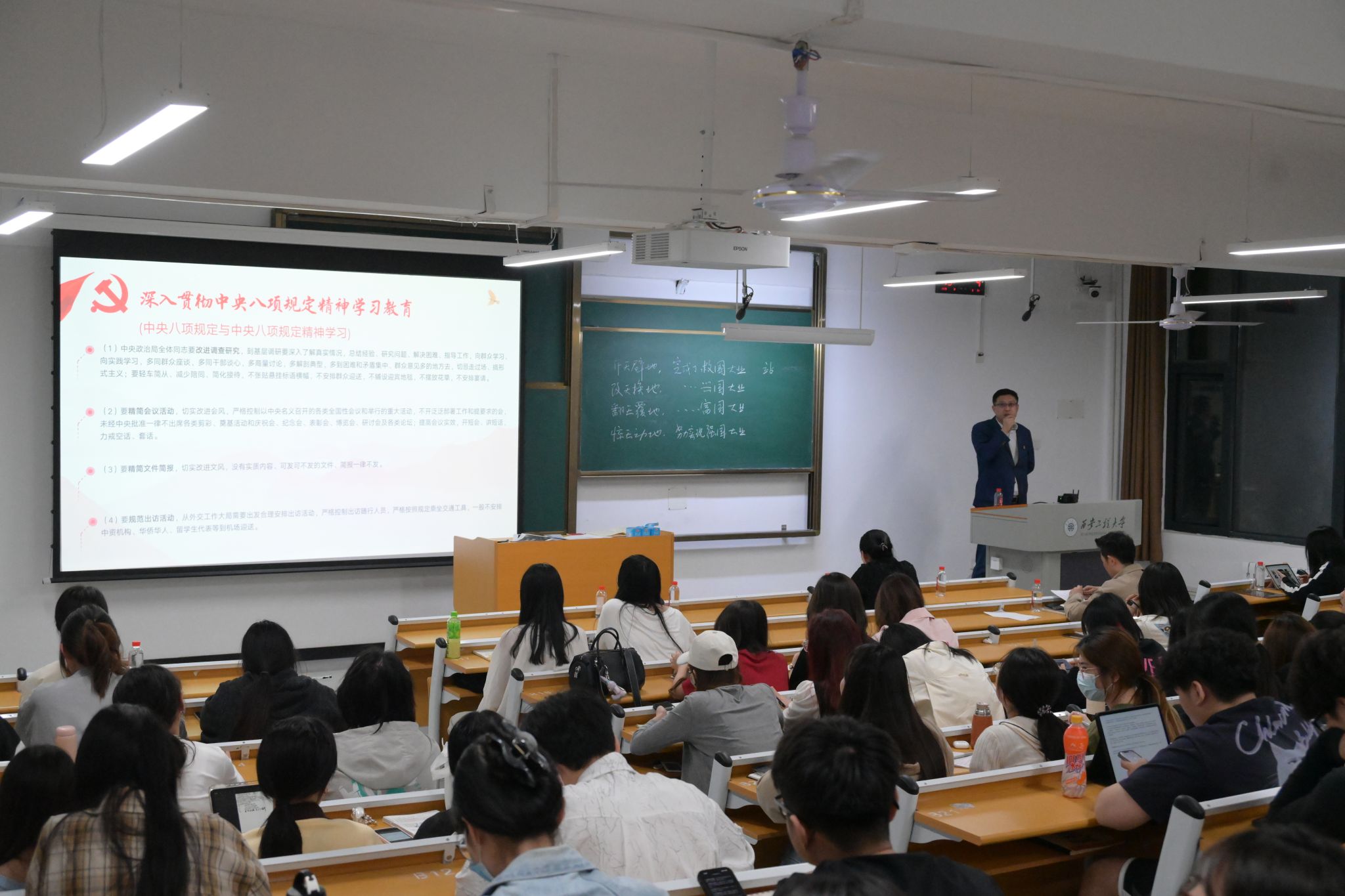 苏博作主题为“百年征程,波澜壮阔”的党课,他以中国共产党带领全国人民取得的举世瞩目成就为引,系统梳理了党在新民主主义革命时期、社会主义革命和建设时期、改革开放和社会主义现代化建设新时期、中国特色社会主义新时代四个历史时期的奋斗历程,深刻阐释了中国共产党在每一阶段展现出的优良品质。苏博以此次党课为契机,带领同学们集体深入学习领会了中央八项规定精神,强调作风建设永远在路上,要求全体学员对标优秀党员,严于律己,争做表率。