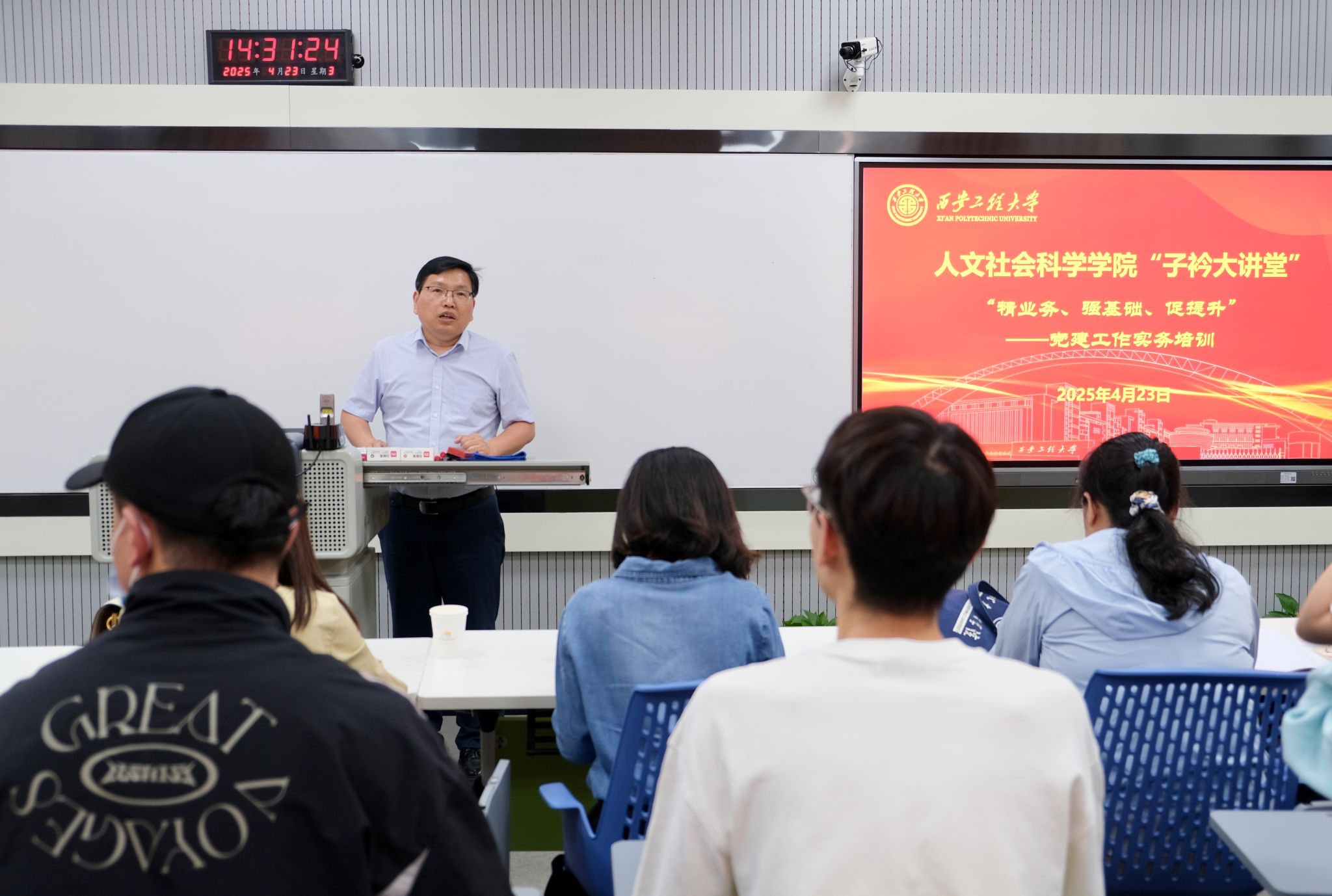 4月23日,人文社会科学学院邀请西安市委党校乔伟其做客学院“子衿大讲堂”,开展党建工作实务培训。学院组织员、党支部书记、支委等共40余人参加培训,培训会由学院党委书记李喜峰主持。