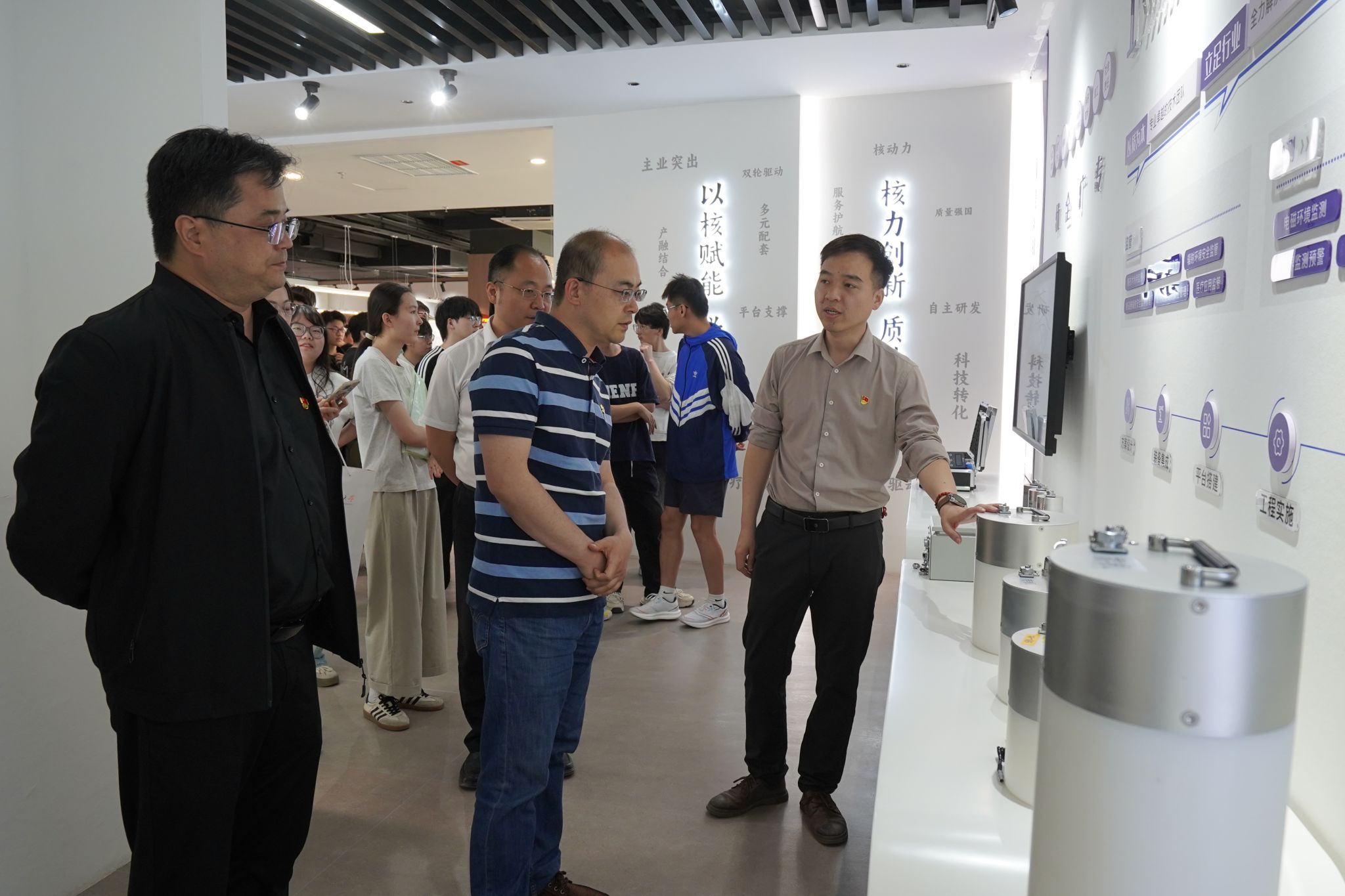 会上,校企双方党员共同进行政治理论学习,大家集中学习了《习近平关于加强党的作风建设论述摘编》第三、四章。双方党员还就党组织建设、党员教育与管理、党建引领促就业等方面展开了深入的交流。秦洲核安公司副总经理刘沧从科技成果、产学研合作、核心业务、研发方向等方面进行阐述,重点介绍了公司在核仪器仪表与装备制造、核与辐射安全技术支持与服务等方面的突破性进展;公司总工程师温小梅表示,公司有意向进一步和理学院安全防御技术团队在辐射防护材料、光热辐射模拟、射线激发荧光粉等研究方向深入合作。中陕核(西安)中子科技有限公司人力资源部门负责人在宣讲中重点介绍了公司产业基础建设情况、主营业务、重点研发产品、行业前景以及公司对人才的需求。张国青详细介绍了学院专业设置、物理学科人才培养特色及2025届毕业生就业情况,表示应用物理专业与秦洲核安在辐射探测技术、核仪器仪表研发等领域具有高度契合性,双方在联合申报科研项目、创新成果转化等有很好的合作前景。与会人员一致认为,未来可以通过组织师生党员参与企业技术攻关突击队,邀请企业劳模进校园开展思政讲座等,进一步促进双方之间的互动共建。会后,学院师生们实地参观了秦洲核安研发中心、生产车间及实验室。学生们一致表示,这次活动直观了解了核技术应用的前沿动态,企业工程师分享的技术案例,与课堂所学理论知识形成有效互补,为自己未来的职业发展打开了更多的机会。