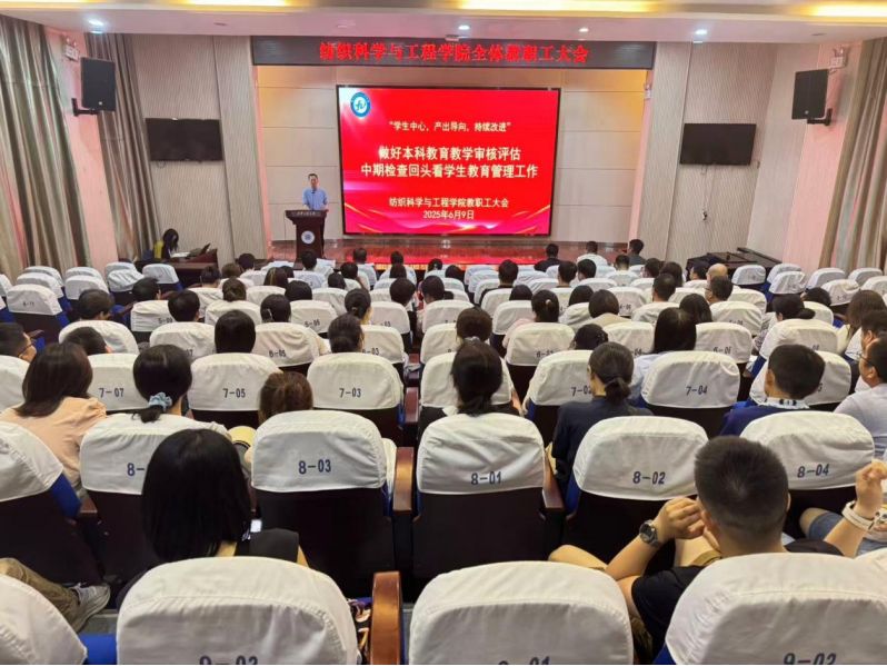 刘哲强调,针对学校审核评估“回头看”相关要求,学院制定了《纺织科学与工程学院迎接审核评估整改中期“回头看”实施方案》,明确了审核评估整改中期“回头看”工作小组,全面配合学校推进学院审核评估各项工作。他还围绕博士生招生、师资队伍建设、学科发展、高水平成果产出、国际合作交流及实验室安全等方面,向全体教师介绍了学院近期取得的成绩、下一步发展规划及存在的不足,并鼓励全体教师凝心聚力,再创佳绩。