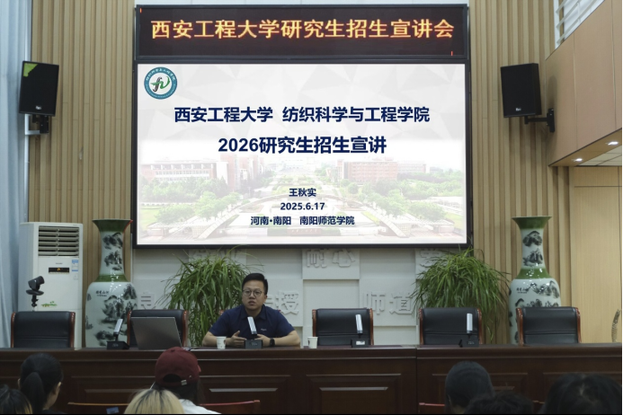 6月27日,纺工系副主任高兴忠赴河南科技学院服装学院进行招生宣讲。高兴忠结合该校新工科建设特色,聚焦“纺织+”交叉培养方向,重点解析了我院纺织科学与工程、材料与化工两个方向的研究生培养特色和优势,并通过展示与企业联合研发的科研成果,生动诠释“论文写在生产线上”的培养理念。