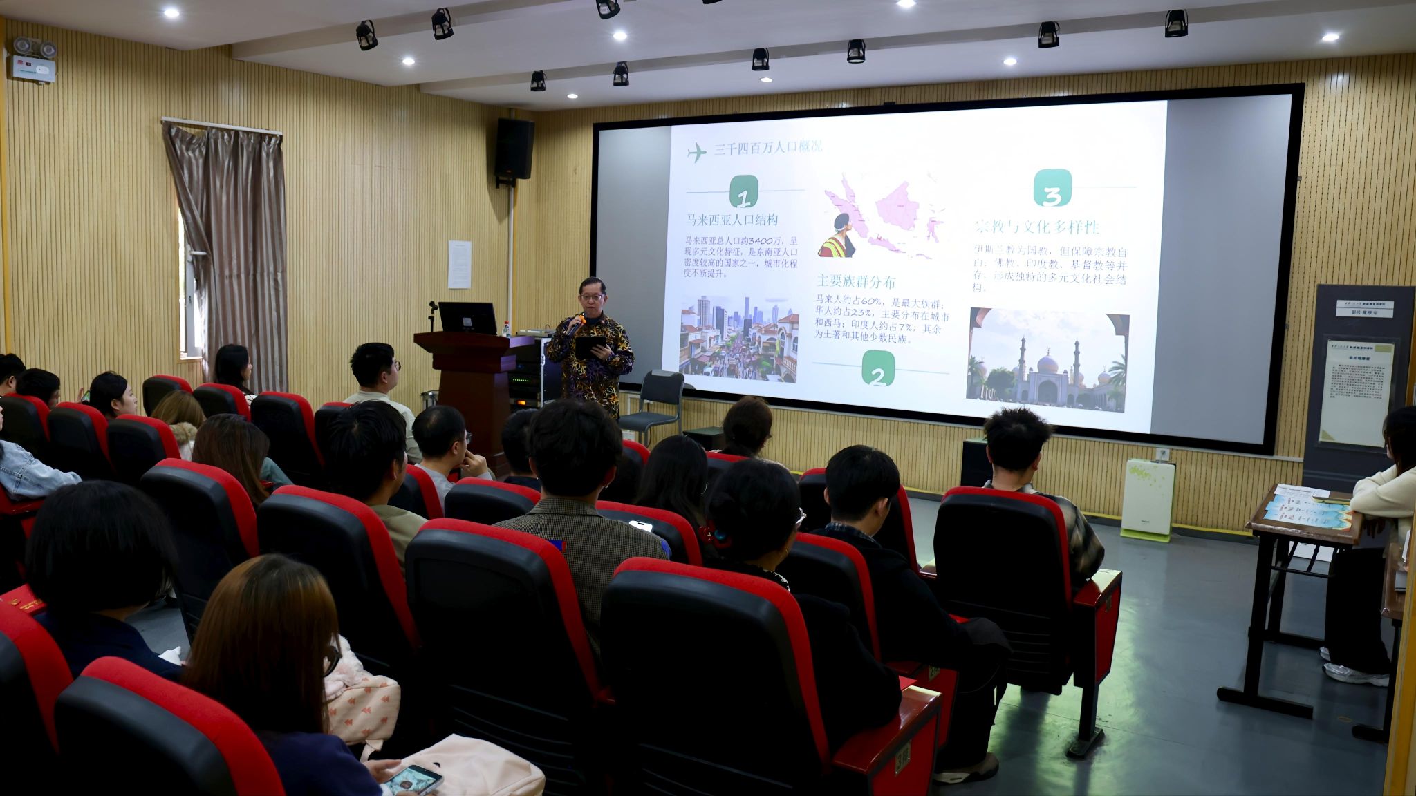 颁奖仪式后,张炳祺博士以《文化交流与传播视角:跨区域的经验分享》为题,为全校师生带来专题学术讲座。讲座中,张博士以马来西亚“多元族群共生、多元文化交融”的地域特色为切入点,结合地理区位优势,系统剖析了马来西亚作为“东西方文化交汇地”的独特文化生态,深入解读东马与西马在文化特质上的差异与互补性,以及多元文化和谐共生的实践经验。