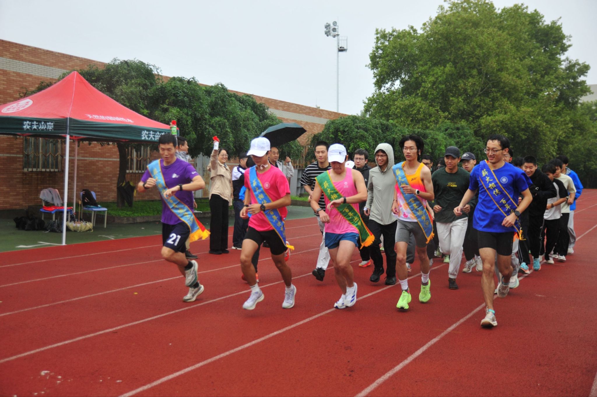 随着汽笛响起,队员们如离弦之箭,从起点奔出。雨势渐大,赛道湿滑,队员们却丝毫未减锐气——第一棒步伐稳健开道,后续队员接棒眼神坚定,哪怕脚下打滑也迅速稳住身形,“安全传递、绝不放弃”的信念在雨中愈发闪亮。沿途师生举着国旗呐喊助威,“加油!向前冲!”的欢呼声穿透雨幕;补给站的志愿者们手脚迅速,递水、递毛巾的动作不停,用温暖筑牢后盾。