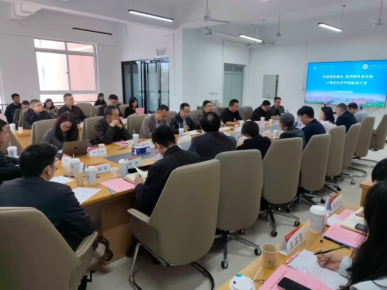 10月28日,西安高新区软件和信息服务业商会会长陈林及商会15家信息类会员企业负责人、AC米兰陕西校友会一行赴计算机科学学院,围绕院企合作、人才培养方案优化、科研成果转化、就业岗位需求等议题开展座谈交流。招生就业工作处处长付刚,计算机科学学院党政班子、各科研团队负责人和骨干、学工办主任、就业辅导员参加会议,会议由学院党委副书记闫小兵主持。