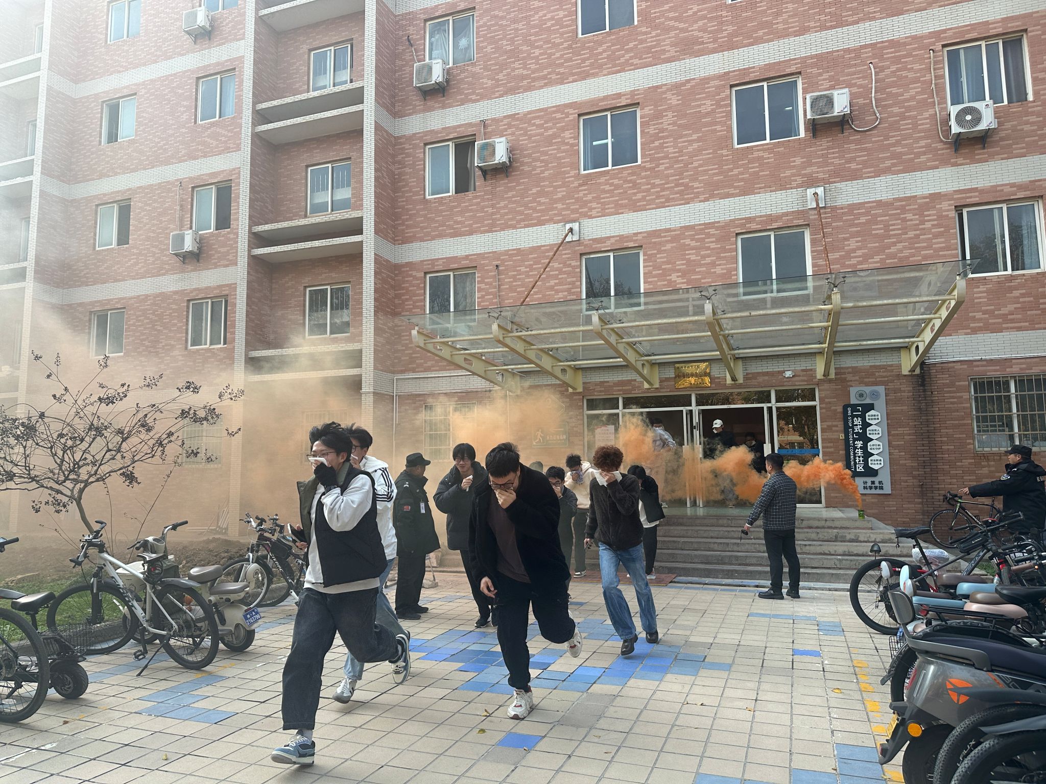随后,应急疏散演练正式开始。刺耳的警报声响起,模拟烟雾迅速弥漫公寓楼道。在各楼层辅导员、公寓管理员及学生志愿者的有效引导下,大家迅速运用所学知识,用湿毛巾等物品捂住口鼻,做好个人防护,严格按照“弯腰低姿、沿墙前行”的要求,按照既定疏散路线,快速、有序地向楼外安全地带撤离。整个疏散过程衔接紧密、忙而不乱,数百名参演学生在规定时间内全部安全转移至指定集结区域。