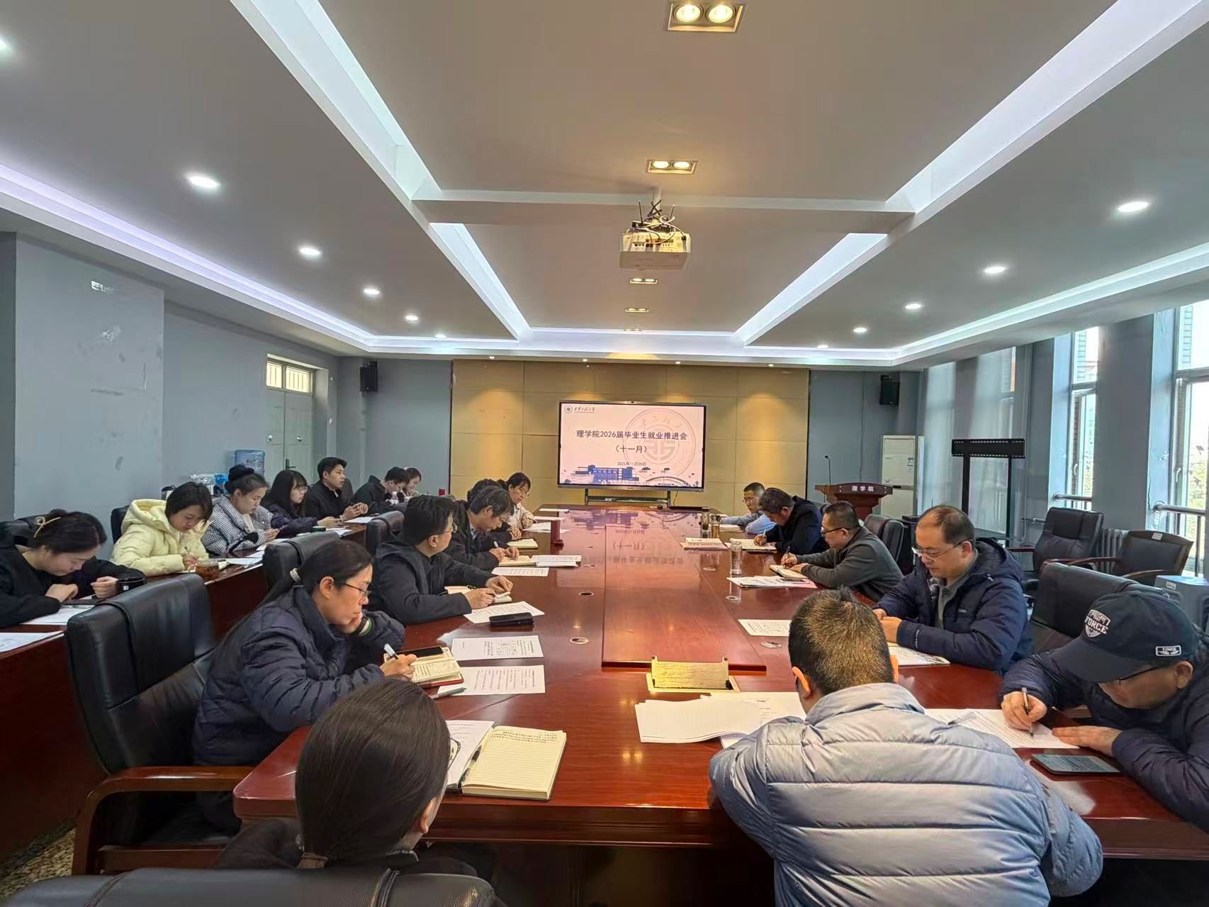 11月20日,理学院召开2026届毕业生就业工作推进会,凝心聚力部署推进毕业生就业重点工作。学院领导班子成员、各系部主任、各党支部书记参加了本次会议。会议由学院党委副书记刘玉森主持。