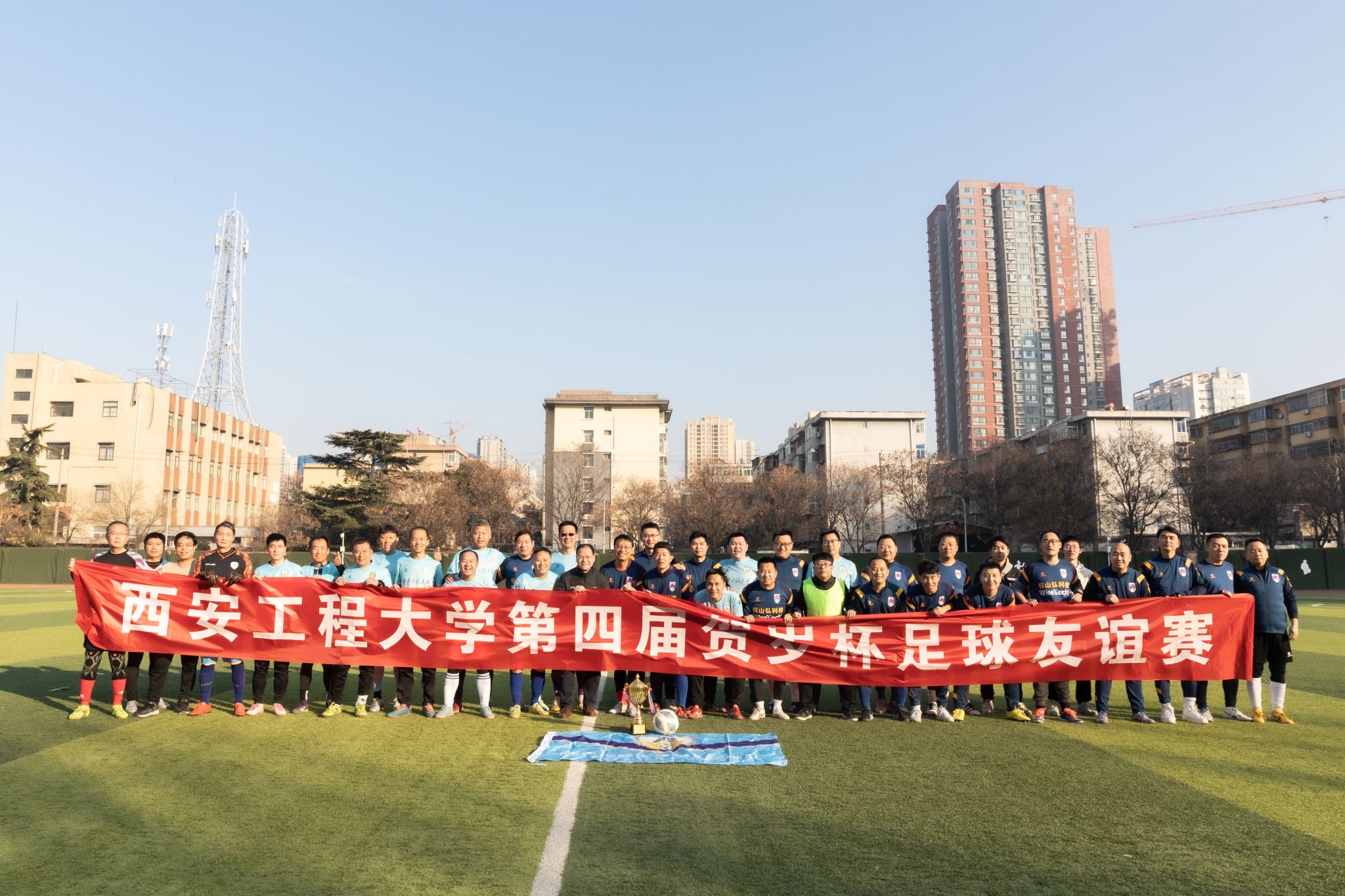 哨声吹响,比赛正式启幕。校友队队员朝气蓬勃,步伐轻快灵动,带球突破、劲射破门一气呵成;教工队老师们配合默契,凭借沉稳严密的防守与精准犀利的反击,稳稳掌控赛场节奏。双方攻防转换间高潮迭起,你来我往的精彩对决让在场观众热血沸腾。终场哨响,比分定格在3:1,教工队战胜校友队,摘得本届“贺岁杯”冠军。