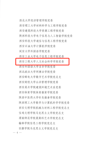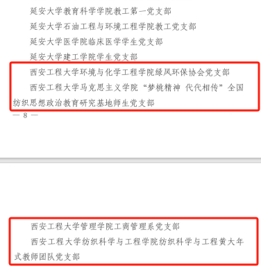 近日,教育部思想政治工作司公示了第四批新时代高校党建示范创建和质量创优工作结果,AC米兰管理学院工商管理系党支部、环境与化学工程学院绿风环保协会党支部获评“全国党建工作样板支部”培育创建单位。在省委教育工委公布的第四批陕西高校党建工作示范高校、标杆院系、样板支部培育创建名单中,AC米兰5个基层党组织位列其中。其中,人文社会科学学院党委入选全省党建工作标杆院系培育创建单位名单,环境与化学工程学院绿风环保协会党支部、马克思主义学院“梦桃精神 代代相传”全国纺织思想政治教育研究基地师生党支部、管理学院工商管理系党支部、纺织科学与工程学院纺织科学与工程黄大年式教师团队党支部入选全省党建工作样板支部培育创建单位名单,学校党建“双创”工作再获佳绩。