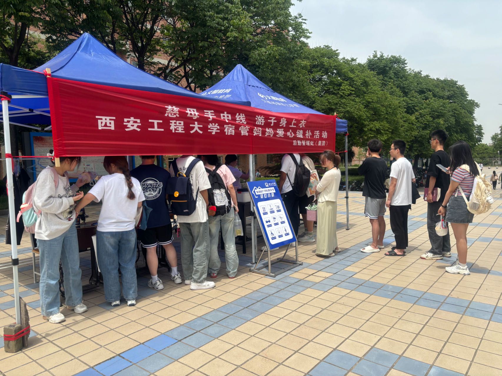 5月11日,后勤管理处(集团)在临潼校区中心广场组织开展“慈母手中线 游子身上衣——宿管妈妈爱心缝补”活动,为工程大学子义务缝补衣物。本次活动旨在为同学们推广位于1号学生公寓B段1楼的爱心驿站服务,让更多同学了解服务内容和地点,以便更广泛的为同学们提供各项生活服务。