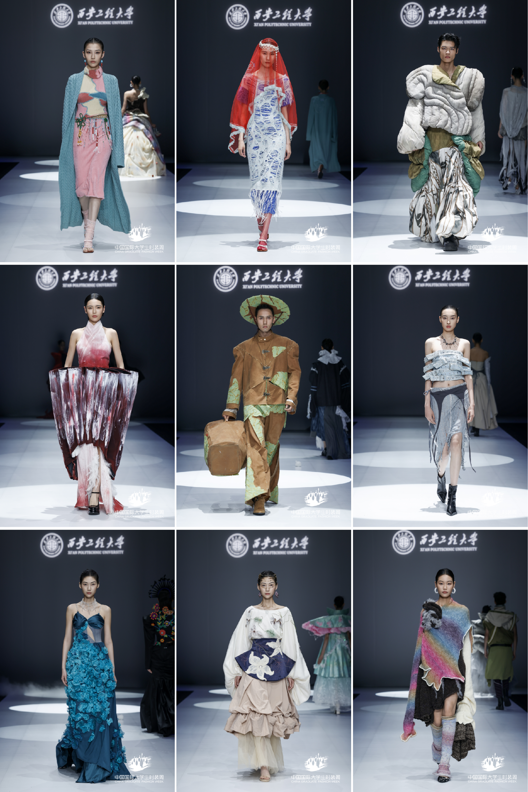 本次发布主题为《齐物·境》,灵感源自《庄子·齐物论》中的哲学思想“万物齐一”,强调万物平等、万象共生。设计团队以此为核心理念,融合“长安”这一中华文明的象征,将周秦汉唐四个朝代的文化意象转化为当代表达,营造出多元、包容、跨越时空的设计语境。学生们将传统元素与现代造型、工艺与可持续理念融合,通过非遗技艺、结构重组、环保材料等手段,实现艺术性与实穿性的结合,体现了青年设计师的独立思考与社会责任感。本届毕业设计作品整体呈现出文化自觉与风格多元的特征,同时学生在数字设计与绿色时尚方面表现突出,广泛应用3D建模、虚拟试衣等技术,并在旧衣改造、生物基材料等方面进行实践,探索可持续路径,展现出更成熟的社会关怀与文化思辨。